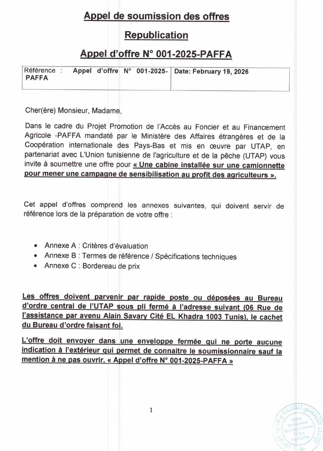 Appel d’offre N° 001-2025-PAFFA Fabrication Cabine installée sur camionnette 02 portes