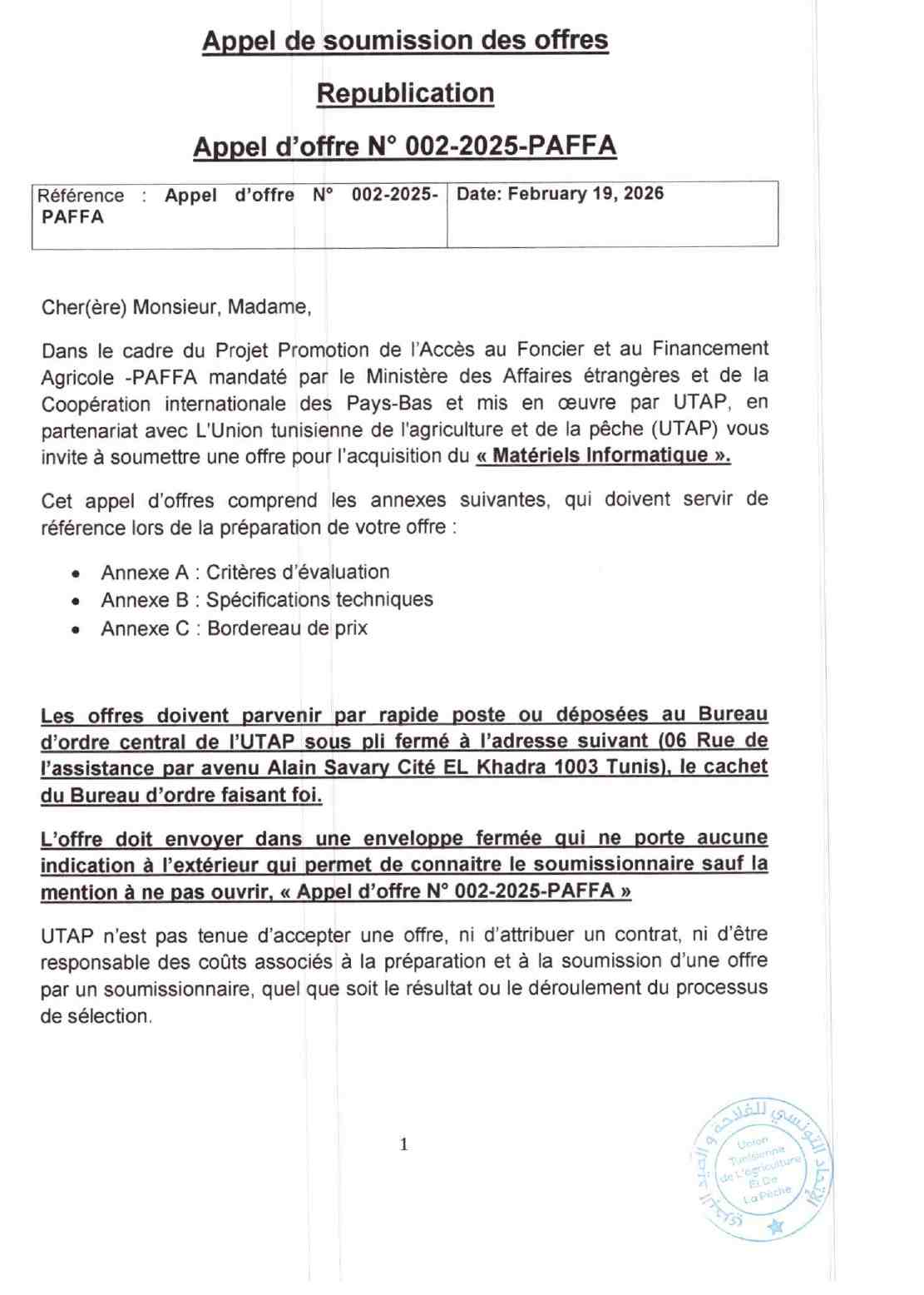 Republication Appel d’offre N° 002-2025-PAFFA Acquisition Matériel Informatique