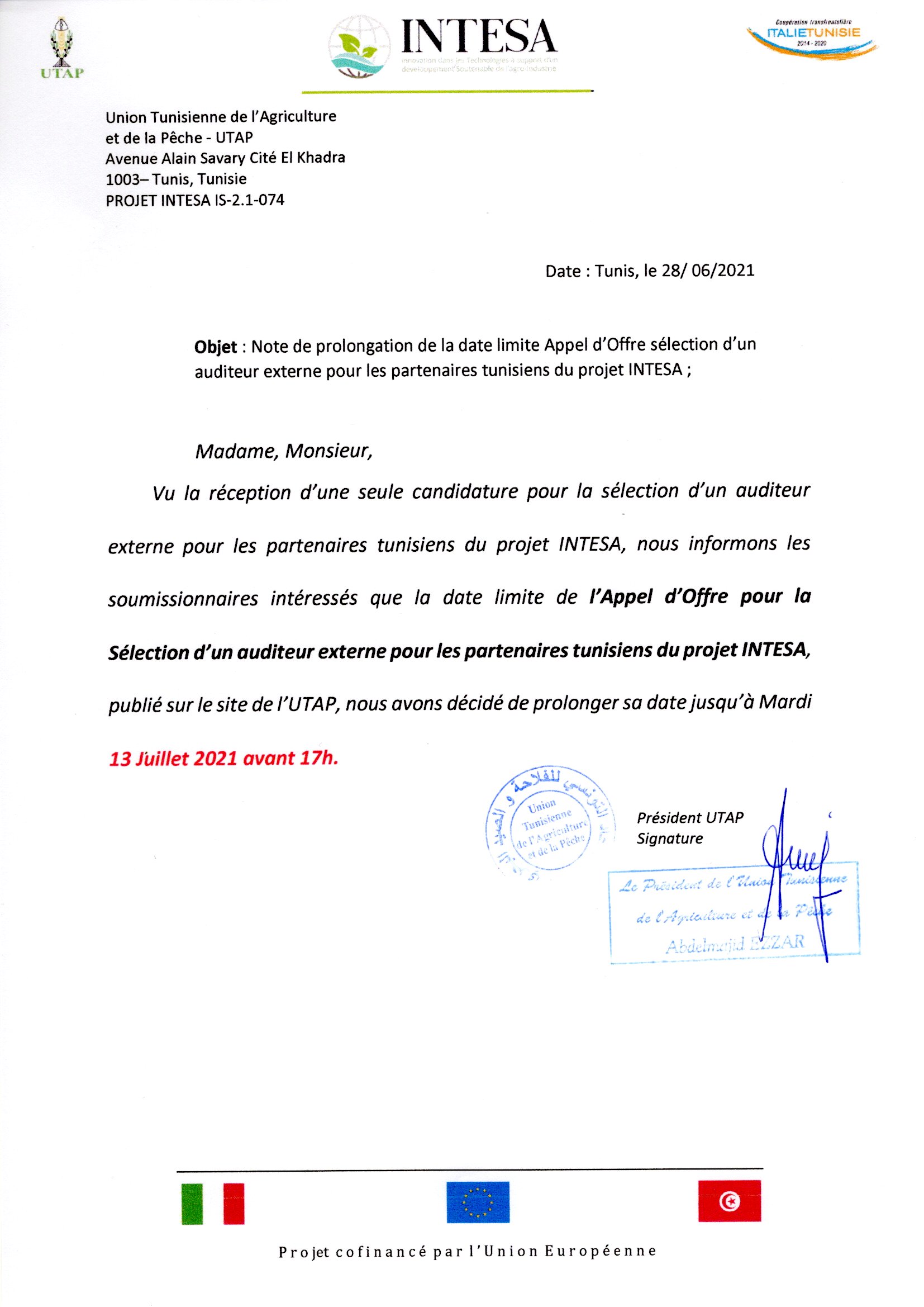 Vu la réception d’une seule candidature pour la sélection d’un auditeur externe pour les partenaires tunisiens du projet INTESA, nous informons les soumissionnaires intéressés que la date limite de l’Appel d’Offre pour la Sélection d’un auditeur externe pour les partenaires tunisiens du projet INTESA, publié sur le site de l’UTAP, nous avons décidé de prolonger sa date jusqu’à Mardi 13 Juillet 2021 avant 17h. Voici le lien de l’AVIS DE SELECTION D’UN AUDITEUR EXTERNE DU PROJET INTESA IS-2.1-074